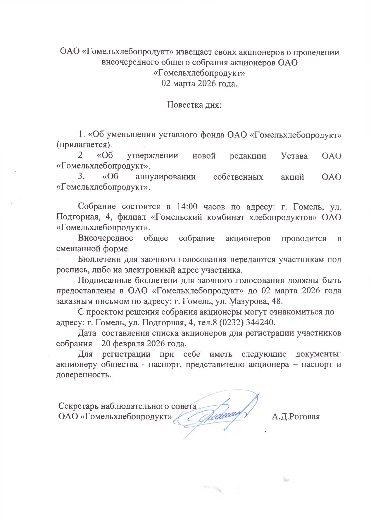 Извещение акционеров о проведении внеочередного общего собрания акционеров ОАО «Г омельхлебопродукт» 02 марта 2026 года