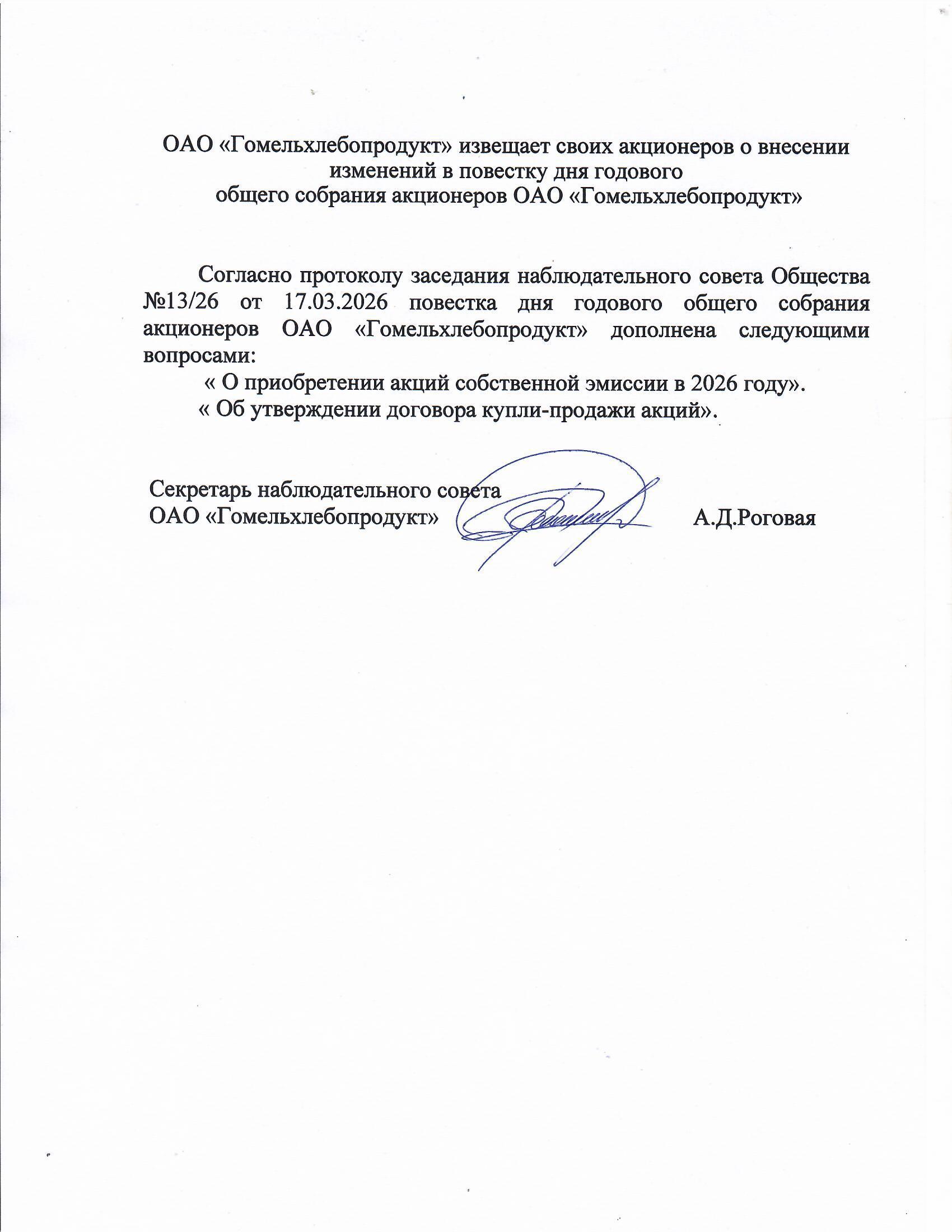 Извещение акционеров о внесении изменений в повестку дня годового общего собрания