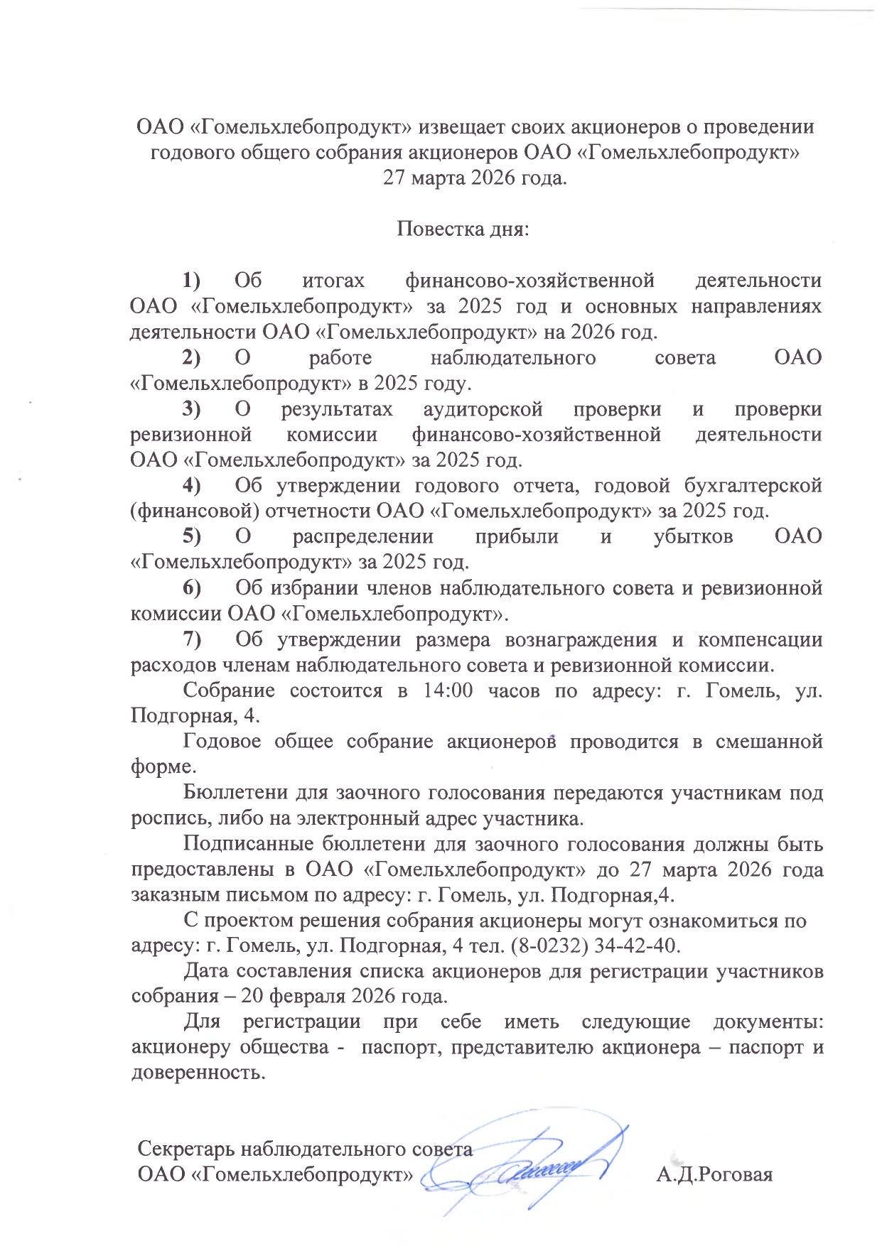 О проведении годового общего собрания акционеров ОАО «Гомельхлебопродукт»